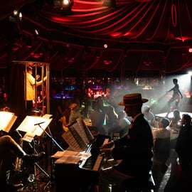 **¿Qué te espera?** Estrellas internacionales del burlesque, acrobacias espectaculares y puestas en escena llenas de fantasía, acompañadas por una banda en directo llena de energía. Un total de unos 20 artistas suben al escenario noche tras noche para transportarte a un mundo entre el varieté, el circo y el glamour. **Tres actos. Cuatro platos. Una velada inolvidable.**