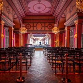 Deja que la música de Strauss, Lanner y Ziehrer te acompañe mientras recorres las elegantes salas y las exposiciones históricas. El recorrido culmina con un espectacular espectáculo audiovisual en la sala de conciertos original, un emotivo homenaje a Johann Strauss Jr., el rey del vals, que cobra vida a través de la música, la luz y la proyección.